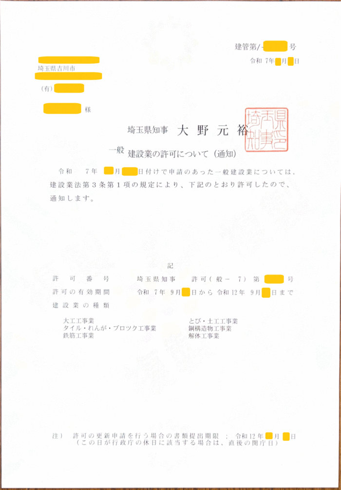 埼玉県知事 令和7年(建築工事業、とび土工工事業、他)
